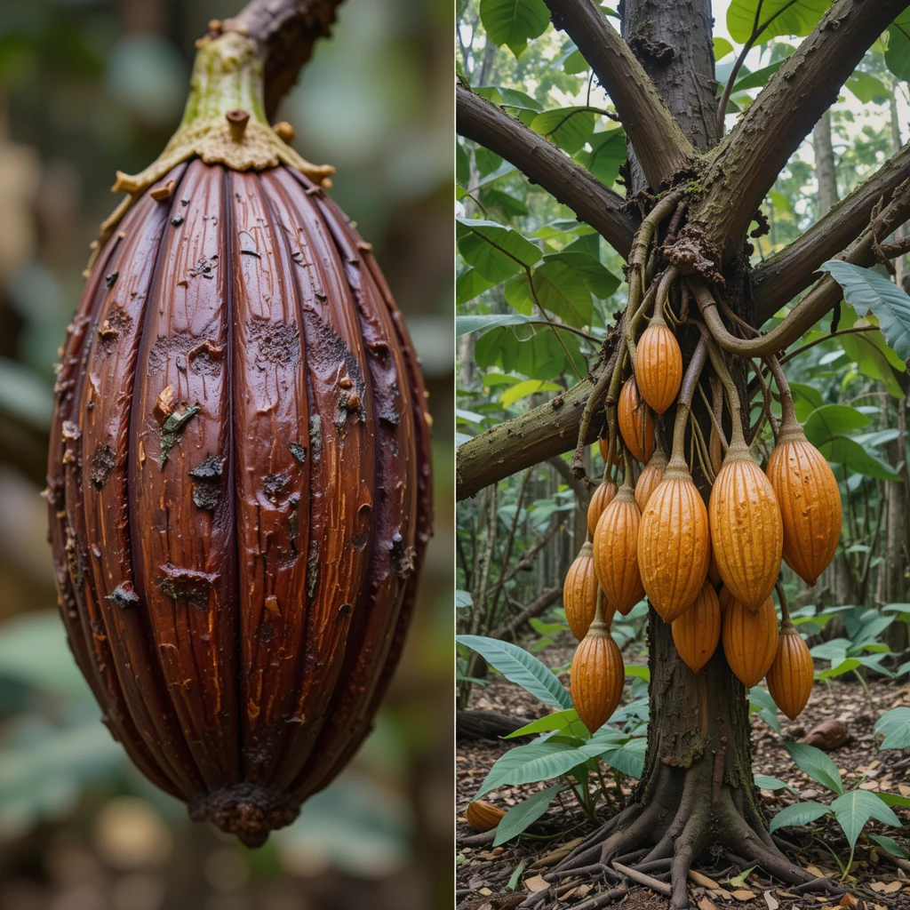 A close-up of raw cacao beans in a pod, showing their natural texture and rich brown color. Alternatively, a cacao tree with ripe pods hanging from its branches in a tropical forest.