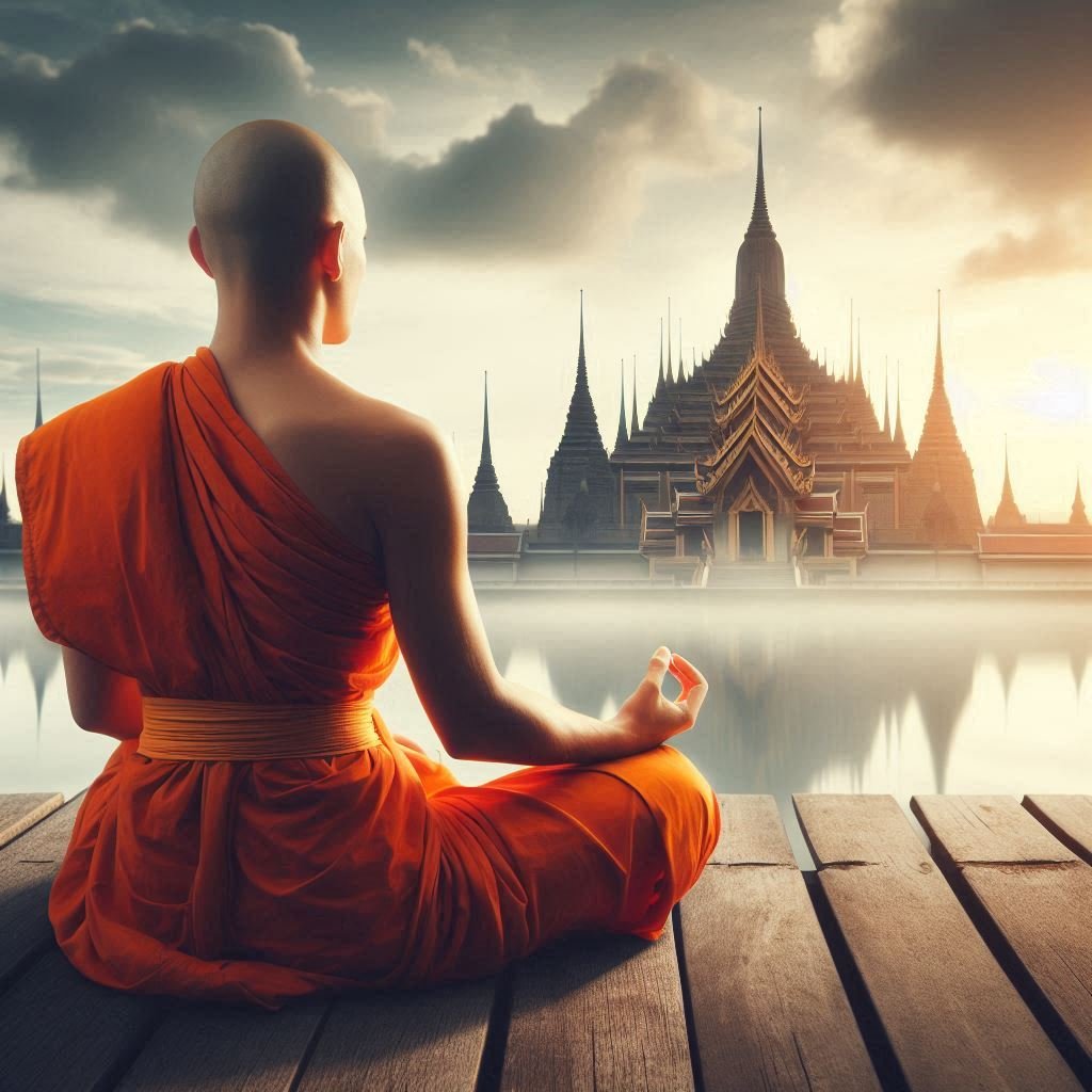 A peaceful monk sitting in meditation, symbolizing a life of celibacy, against a background of a serene monastery or temple.