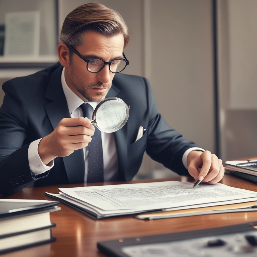 A business professional reviewing financial documents with a magnifying glass, symbolizing careful research and risk assessment.