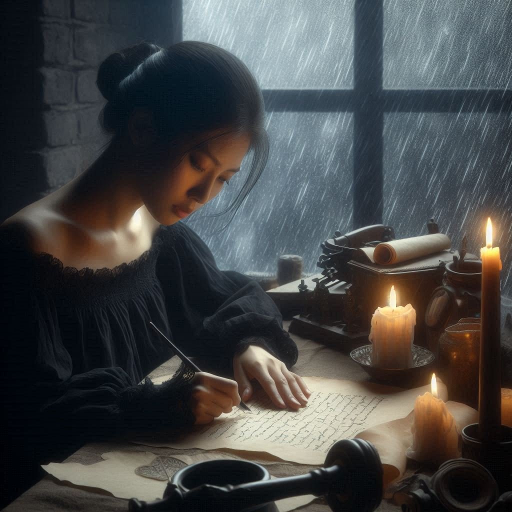 A melancholic poet sitting by a candlelit desk, writing an elegy on parchment, with a backdrop of a dark, rainy window.