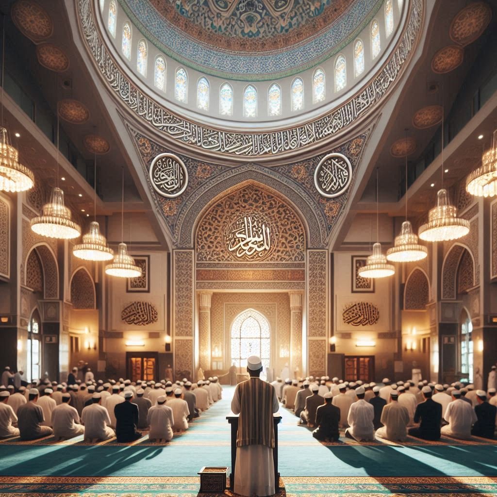 A respected Imam standing inside a beautifully designed mosque, leading a congregation in prayer. The mosque has intricate Islamic calligraphy, a grand dome, and warm lighting, creating a spiritual ambiance.