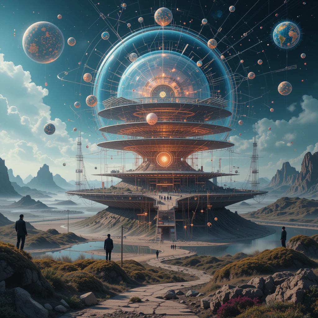 A futuristic digital landscape where multiple layers of reality overlap, symbolizing the concept of ‘meta.’ The image includes abstract representations of interconnected thoughts and ideas, showing self-referential and higher-level abstraction.