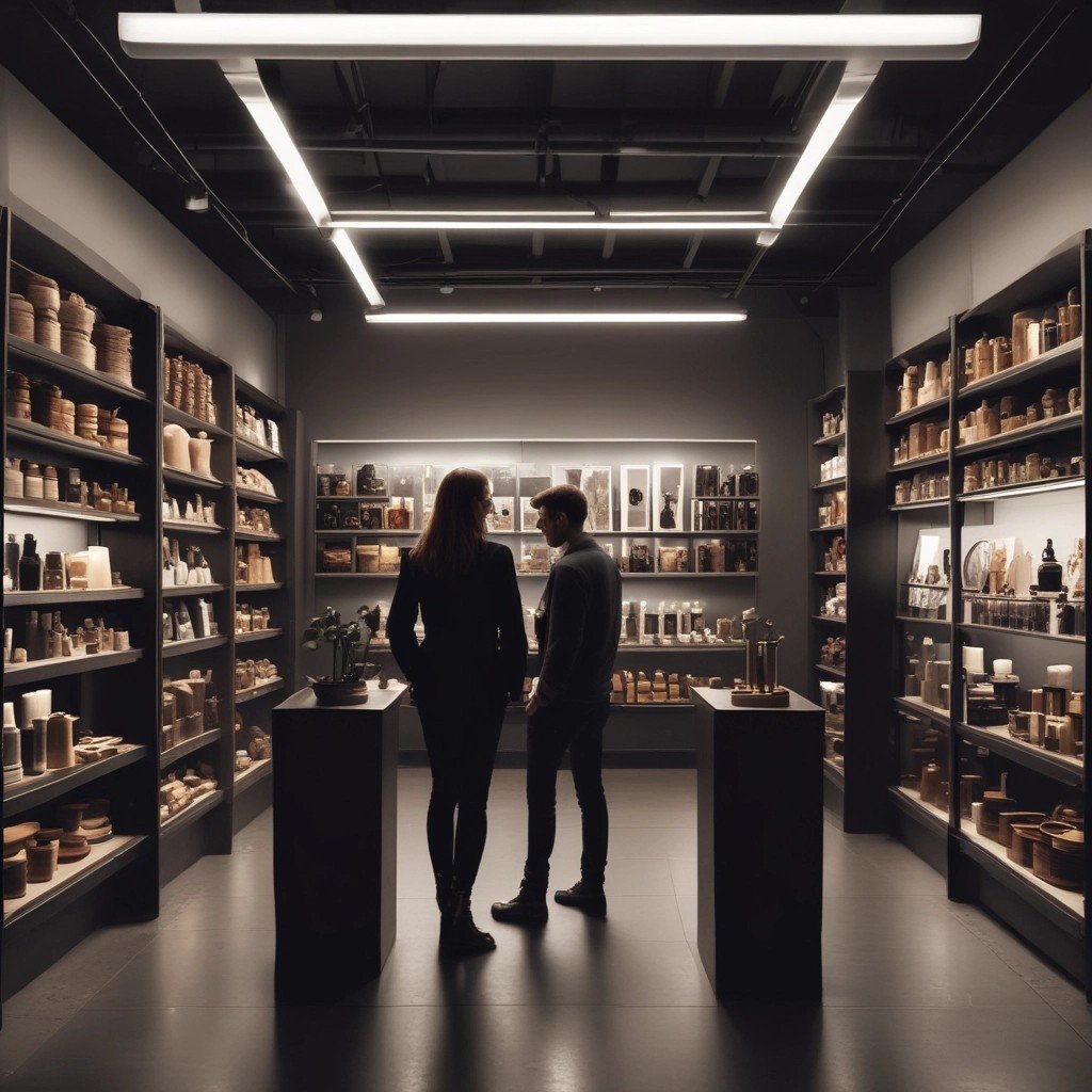 A person standing confidently in a small, well-lit space while the surrounding area is dark, symbolizing finding one’s unique place. Alternatively, a shop displaying rare and specialized products, highlighting a niche market.