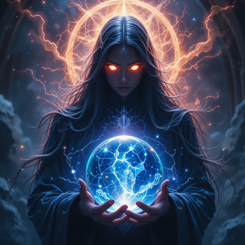 A mysterious figure with glowing eyes, surrounded by an aura of energy, symbolizing psychic abilities. Alternatively, a crystal ball reflecting visions of the future, representing supernatural foresight.