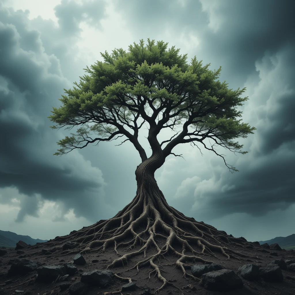 A strong tree standing tall in the middle of a storm, its roots firmly planted in the ground, symbolizing resilience. Despite the harsh winds, it remains unshaken, representing strength, perseverance, and endurance.