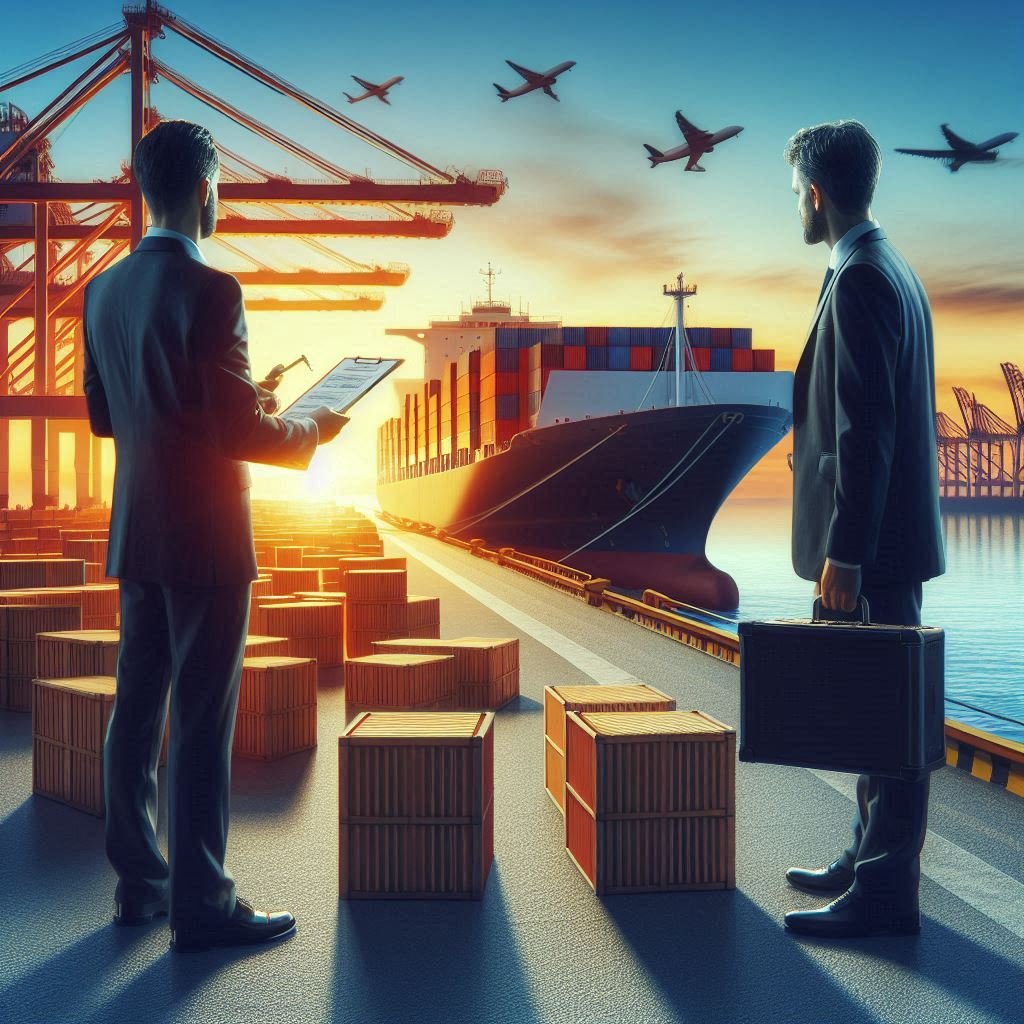 A cargo ship at a customs port with goods being inspected, symbolizing trade regulations and tariffs.