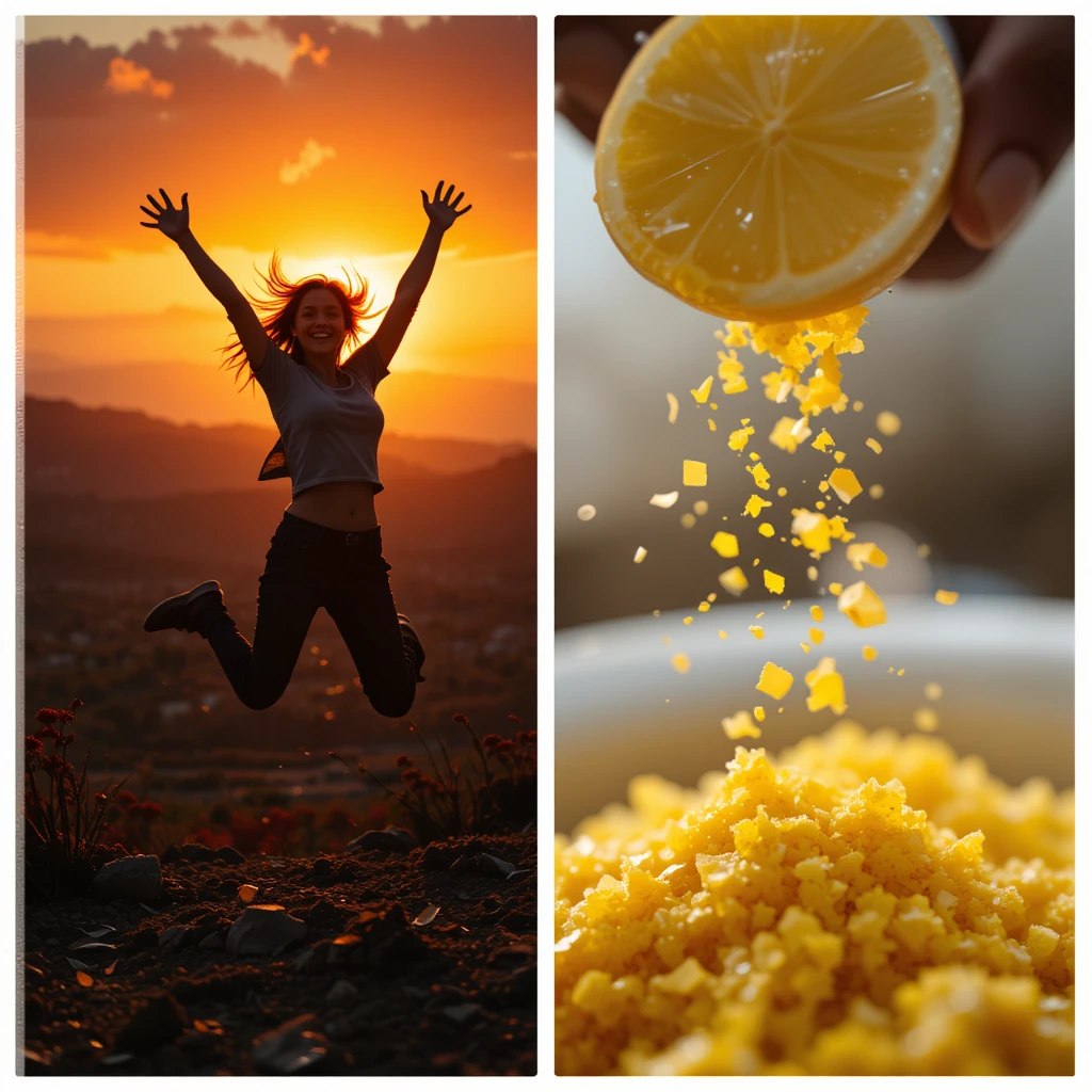 A vibrant image of a person joyfully jumping in the air against a colorful sunset, symbolizing enthusiasm and zest for life. Alternatively, a close-up of fresh lemon zest being added to a dish, highlighting the secondary meaning of the word.